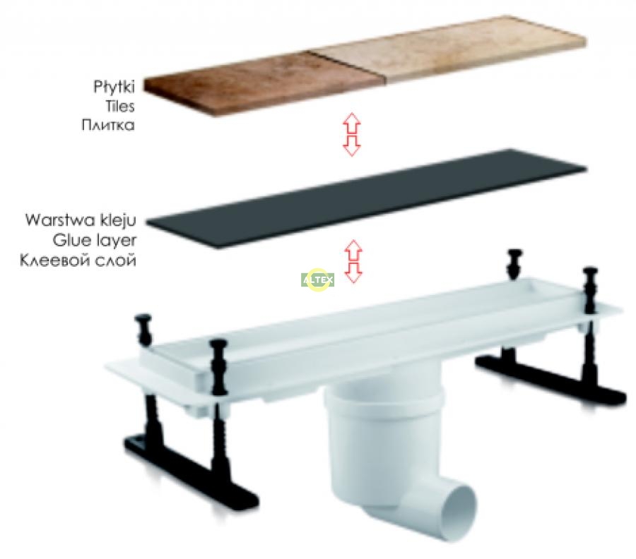 | Доп. элементы | Гидрозатвор, регулируемая высота, подрезка под плитку |