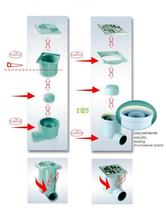 В наличии модели с различной высотой корпуса, направлением выпуска и типом монтажа. Подходят для подключения к трубам Ø50 и Ø110 мм. Решетка из нержавеющей стали придает эстетичный вид и повышает прочность конструкции.