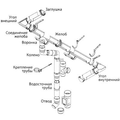 Желоб угловой внутренний предназначен для стыковки водосточных желобов на внутреннем углу крыши под 90 градусов. Желоба соединяются с фасонными изделиями на защелку, а соединение герметизируется резиновым уплотнителем.